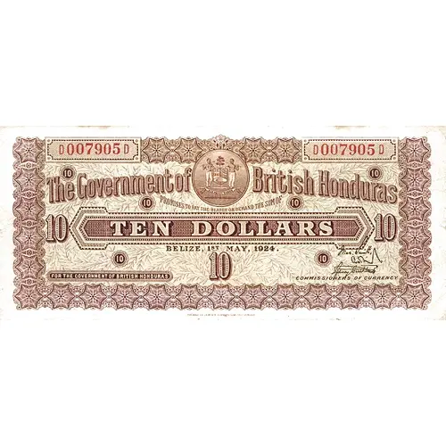 Obverse lettering The Government of British Honduras PROMISE TO PAY THE BEARER ON DEMAND THE SUM OF TEN DOLLARS BELIZE, 1st MAY, 1924. FOR THE GOVERNMENT OF BRITISH HONDURAS COMMISSIONERS OF CURRENCY 10