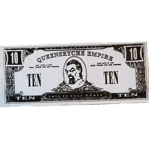 | Obverse lettering | NOT NEGOTIABLE QUEENSRYCHE EMPIRE THIS NOTE IS NOT LEGAL TENDER FOR ANY PURPOSE TEN THIS IS PLAY MONEY |