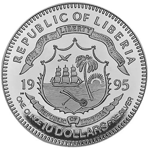 | Averslegende | REPUBLIC OF LIBERIA THE LOVE OF LIBERTY BROUGHT US HERE 1995 REPUBLIC OF LIBERIA ONE OUNCE 10 DOLLARS FINE SILVER |