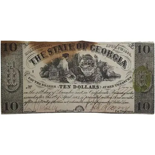 | Obverse lettering | Milledgeville, April 6th 1864. THE STATE OF GEORGIA PAY THE BEARER TEN DOLLARS AT HER TREASURY On the 25th day of December next in Confederate Treasury notes issued after the 1 of April 1864, if presented within three months after maturity, otherwise not redeemable except for payment of Public Dues. |