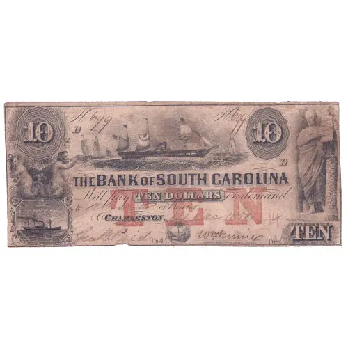 | Opis líce | THE BANK OF SOUTH CAROLINA Will pay TEN DOLLARS on demand to ________ or bearer. CHARLESTON_______________. _______Cash.r _________Pres.t Rawdon, Wright, Hatch & Edson, New York |