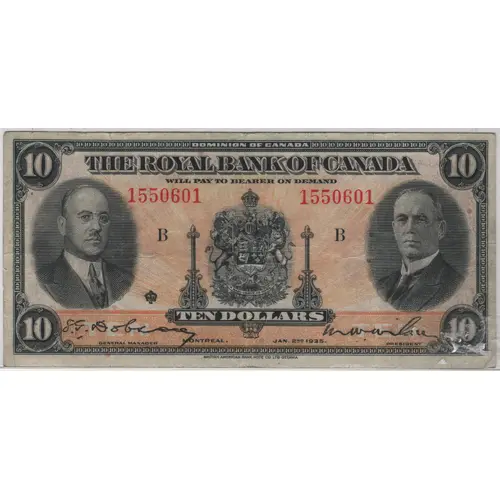 | Obverse lettering | DOMINION OF CANADA 10 THE ROYAL BANK OF CANADA 10 WILL PAY TO THE BEARER ON DEMAND TEN DOLLARS 10 10 GENERAL MANAGER MONTREAL JAN 2ND 1935 PRESIDENT BRITISH AMERICAN BANK NOTE CO LTD OTTAWA |