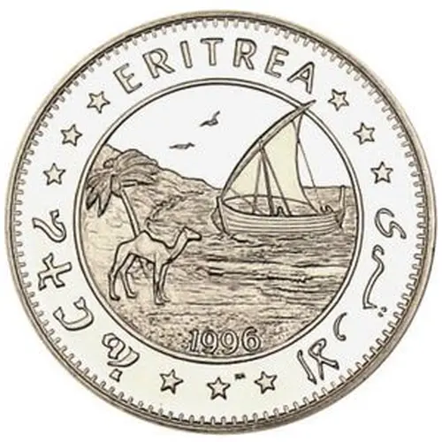 | Obverse description | Palm, camel and a dhow on the sea, in circle. Legend in Tigrinya, English and Arabic around the toothed rim. |