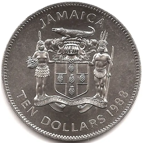 | Obverse lettering | JAMAICA TEN DOLLARS 1988 OUT OF MANY, ONE PEOPLE |