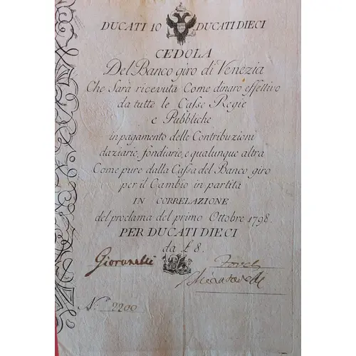 | Надписи лицевой стороны | DUCATI 10 DUCATI DIECI CEDOLA Del Banco giro di Venezia Che Sarà ricevuta Come dinare effettivo da tutte le Casse Regie c Pubbliche in pagamento delle Contribuzioni daziarie, fondiarie, e qualunque altra Come pure dalla Casa del Banco giro per il Cambio in partita IN CORRELAZIONE del proclama del primo Ottobre 1798. PER DUCATI DIE CI da £8. |