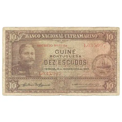 BANCO NACIONAL ULTRAMARINO DECRETO Nº 17.154 GUINÉ PORTUGUESA DEZ ESCUDOS LISBOA, 16 de NOVEMBRO de 1945. (Translation: National Bank Overseas Decree no. 17,154 Portuguese Guinea Ten Escudos Lisbon, November 16, 1945.) |