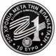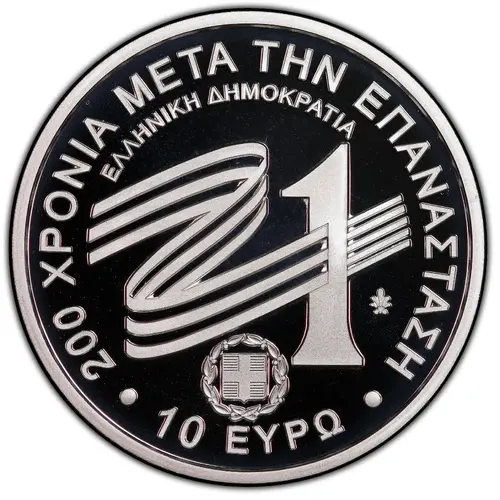 | Mô tả mặt trước | Logo `21` of the commitee `Greece 2021`, small Greek Coat of Arms, mintmark and country name `ΕΛΛΗΝΙΚΗ ΔΗΜΟΚΡΑΤΙΑ` (Greek Democracy). Subject and value `200 ΧΡΟΝΙΑ ΜΕΤΑ ΤΗΝ ΕΠΑΝΑΣΤΑΣΗ • 10 ΕΥΡΩ •` (200 Years since the Revolution 10 Euro) |