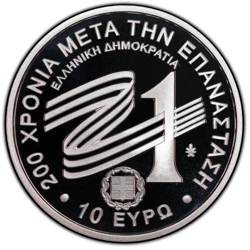 | Obverse description | Logo `21` of the commitee `Greece 2021`, small Greek Coat of Arms, mintmark and country name `ΕΛΛΗΝΙΚΗ ΔΗΜΟΚΡΑΤΙΑ` (Greek Democracy). Subject and value `200 ΧΡΟΝΙΑ ΜΕΤΑ ΤΗΝ ΕΠΑΝΑΣΤΑΣΗ • 10 ΕΥΡΩ •` (200 Years since the Revolution 10 Euro) |