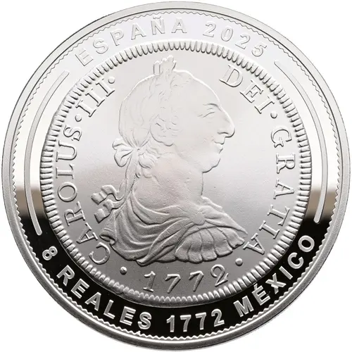 | Legenda del dritto | ESPAÑA 2025 CAROLUS · III · DEI · GRATIA · 1772 · 8 REALES 1772 MÉXICO (Translation: Spain 2025 Charles III by the Grace of God) |