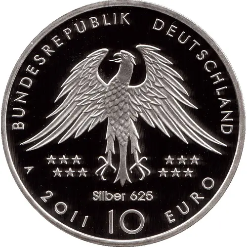| Obverse description | Representation of the stylized federal eagle and the twelve stars of the European Union in the center of the coin distributed on each side of the eagle. Above the name of the state `BUNDESREPUBLIK DEUTSCHLAND`, the Federal Republic of Germany. Below the eagle the words `Silber 625`, silver 625‰, appears to avoid any confusion with the coin minted in cupronickel. Below near the scroll is the Berlin workshop mark on the left by the letter `A`, the year `2011` and the face value `10 EURO`. |