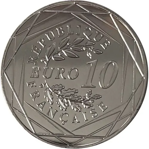 The face value `10 EURO` between two branches of laurel and oak, surrounded by the inscription `RÉPUBLIQUE FRANÇAISE` in three hexagons. |