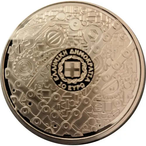 | Popis líce | Greece coat of arms on a background of tools and mechanical components. |