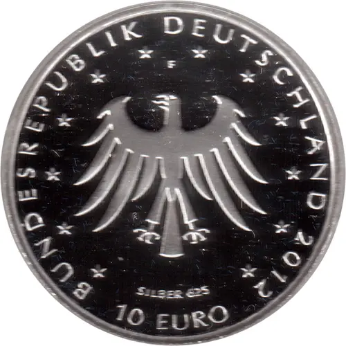 | Obverse description | The stylized federal eagle surrounded by the twelve stars of the European Union in the center of the coin. Above the name of the state `BUNDESREPUBLIK DEUTSCHLAND`, the Federal Republic of Germany. Below the eagle is the year `2012`, the face value `10 EURO` and the words `Silber 625`, silver 625‰, to avoid any confusion with the coin minted in cupronickel. Above the eagle is the mark of the Stuttgart workshop by the letter `F`. |