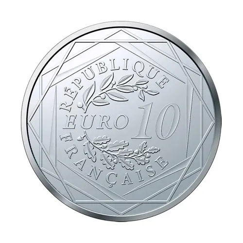 The reverse side shows the face value surrounded by two branches of oak and laurel, framed by three concentric hexagons. |