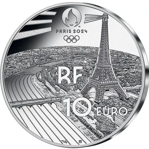 Under the logo of the Olympic Games of Paris 2024, a view of Paris. The Eiffel Tower is posed in front of the Seine stylized as an athletics track. |