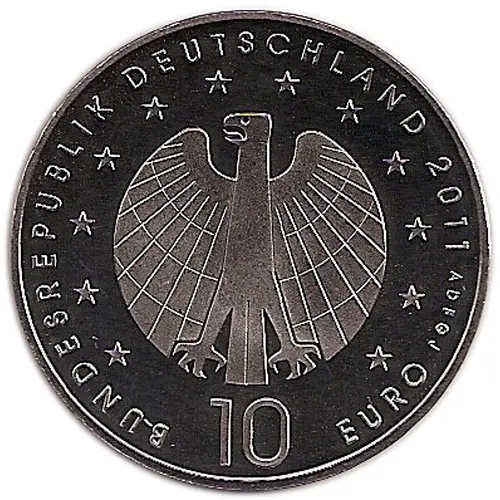 | Obverse lettering | BUNDESREPUBLIK DEUTSCHLAND 2011 ADFGJ 10 EURO (Translation: Federal Republic of Germany 2011 ADFGJ 10 Euro) |