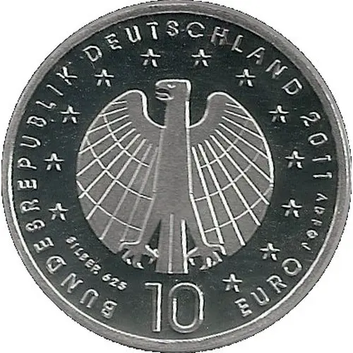 | Obverse description | The stylized federal eagle surrounded by the twelve stars of the European Union in the center of the coin. Around the eagle the name of the state `BUNDESREPUBLIK DEUTSCHLAND`, the Federal Republic of Germany, the year `2011`, the mintmark by a letter `A` `D` `F` `G` or `J` and the face value `10 EURO`. Under the eagle the mention `Silber 625`, silver 625‰, to avoid any confusion with the coin struck in cupronickel. |