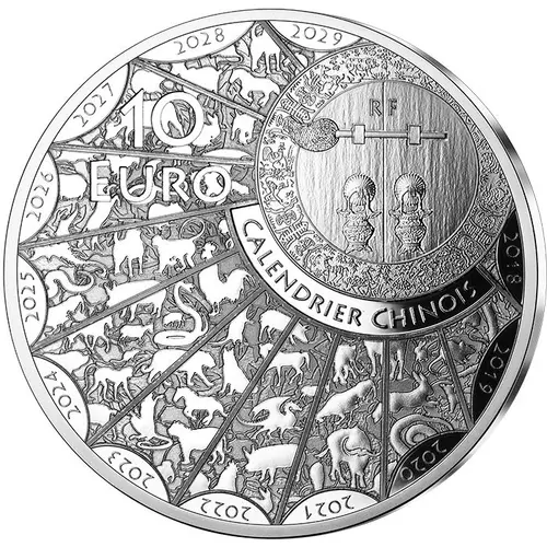 | Obverse lettering | RF 10 EURO CALENDRIER CHINOIS 2018 2019 2020 2021 2022 2023 2024 2025 2026 2027 2028 2029 |