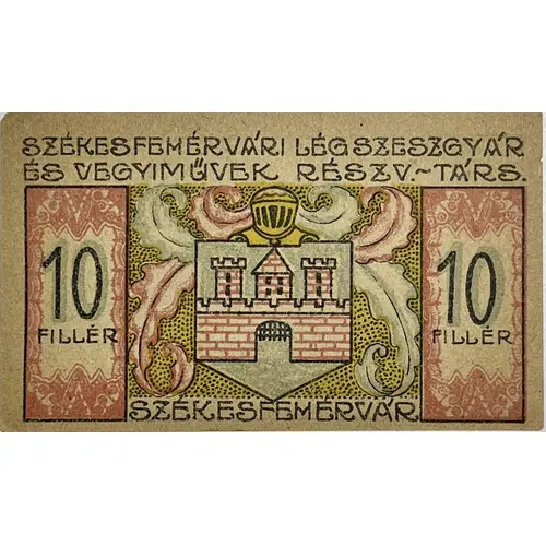 | Obverse lettering | SZÉKESFEHÉRVÁRI LÉGSZESZGYÁR ÉS VEGYIMŰVEK RÉSZV.TÁRS. 10 FILLÉR SZÉKESFEHÉRVÁR (Translation: SZÉKESFEHÉRVÁR GAS AND CHEMICAL PLANT JOINT STOCK COMPANY 10 FILLÉR SZÉKESFEHÉRVÁR) |