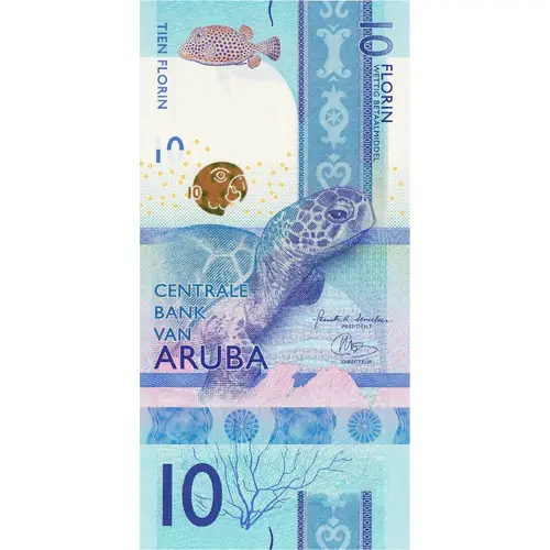 | Reverse lettering | TIEN FLORIN WETTIG BETAALMIDDEL 10 CENTRALE BANK VAN ARUBA 1 januari 2019 AUTEURSRECHT CENTRALE BANK VAN ARUBA © (Translation: Ten Florin Legal Tender 10 Central Bank of Aruba January 1, 2019 Copyright Central Bank of Aruba ©) |