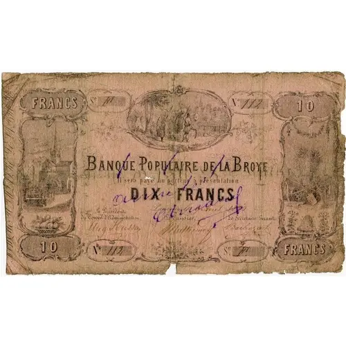正面铭文 FRANCS 10 BANQUE POPULAIRE DE LA BROYE Il sera payé au porteur à présentation DIX FRANCS Payerne, le 9 Aout 1870 Le Président Du Conseil d`Administration. Le Caissier. Le secretaire Gérant. 10 FRANCS
