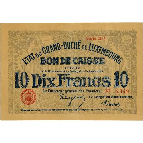 | Obverse lettering | ETAT DU GRAND-DUCHÉ DE LUXEMBOURG BON DE CAISSE au porteur Loi du 28 novembre 1914 - Arrêté g.-d. du 11 décembre 1918 10 Dix Francs 10 Le Directeur général des Finances Le Délégue du Gouvernment Ceux qui auront contrefait ou falsifié des Bons de caisse seront punis des travaux forcés de 15 à 20 ans. (Translation: State of the Grand Duchy of Luxembourg Cash Voucher To bearer Law of November 28, 1914 - General Decree from December 11, 1918 Ten Francs The Director-General of Finances / The Government Delegate Those who have counterfeited or falsified Cash Vouchers will be punished with forced labor for 15 to 20 years.) |