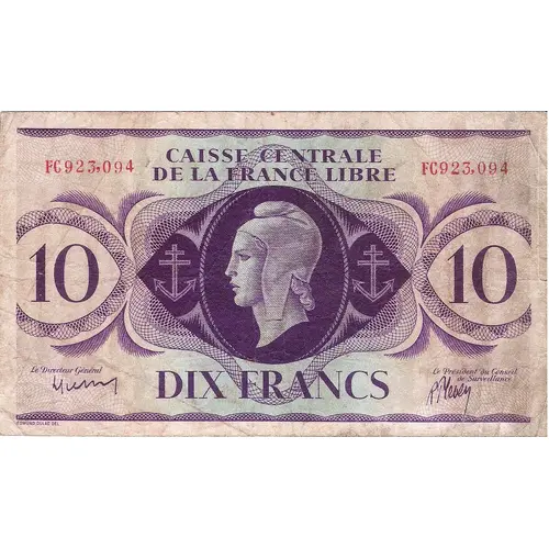 | Obverse lettering | CAISSE CENTRALE DE LA FRANCE LIBRE DIX FRANCS EDMUND DULAC DEL. (Translation: Central Fund of Free France Ten Francs) |