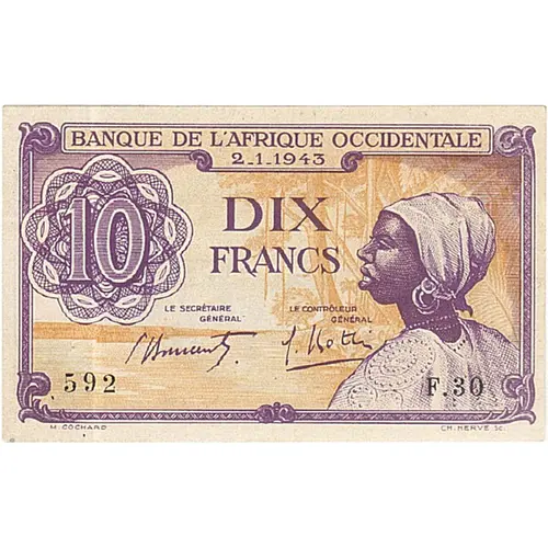 | Obverse lettering | BANQUE DE L`AFRIQUE OCCIDENTALE DIX FRANCS M COCHARD CH. HERVÉ SC. |