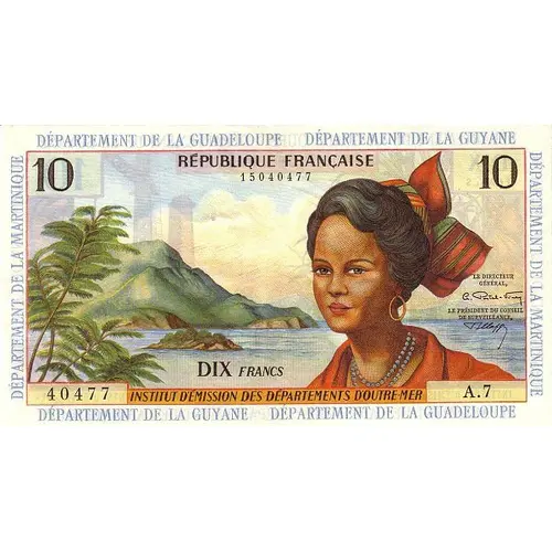 | Reverse description | Shoreline with houses at left, man and woman at right. Overprint: DEPARTEMENT DE LA GUADELOUPE - DEPARTEMENT DE LA GUYANE - DEPARTEMENT DE LA MARTINIQUE |