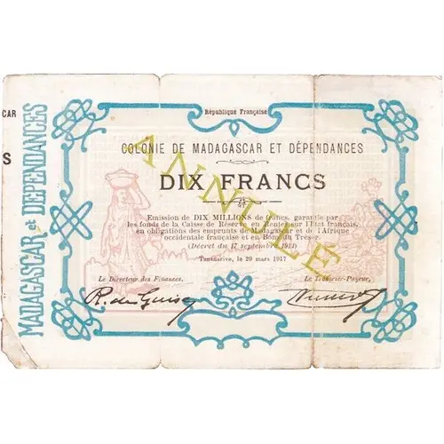 République Françaises COLONIE DE MADAGASCAR ET DEPENDANCES 10 FRANCS Emission de DIX MILLIONS de francs garentie par les fonds de la Caisse de Réserve en Rentes sur l`Etat Français en obligation des emprunts de Madagascar et de l`Afrique occidentale française et en bon du Trésor. `Décret du 17 Septembre 1914) Tananarive, le 29 Mars 1917 Le Directeur des Finances Le Trésorier Payeur |