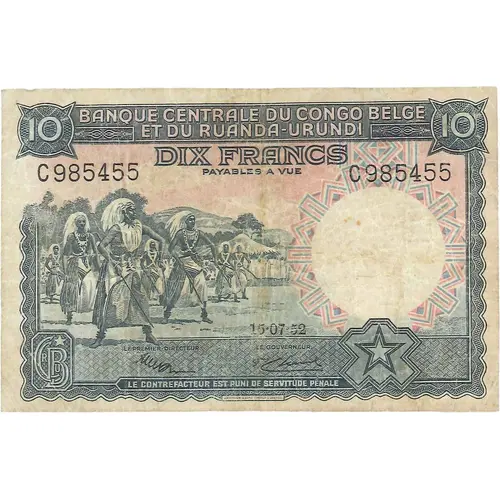 | Obverse lettering | BANQUE CENTRALE DU CONGO BELGE ET DU RUANDA-URUNDI DIX FRANCS PAYBLES A VUE LE CONTREFACTEUR EST PUNI DE SERVITUDE PENALE |