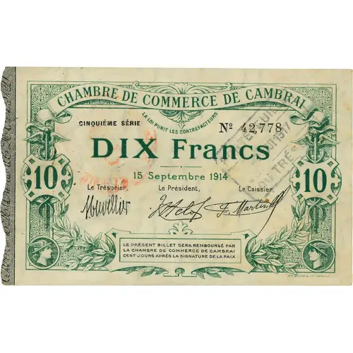 | Obverse lettering | CHAMBRE DE COMMERCE DE CAMBRAI CINQUIEME SERIE LA LOI PUNI LES CONTREFACTEURS N° 42778 DIX FRANCS 10 15 Septembre 1914 Le Trésorier Le Président Le Caissier LE PRÉSENT BILLET SERA REMBOURSÉ PAR LA CHAMBRE DE COMMERCE DE CAMBRAI CENT JOURS APRÈS LA SIGNATURE DE LA PAIX. IMP. DELIGNE & CIE CAMBRAI |