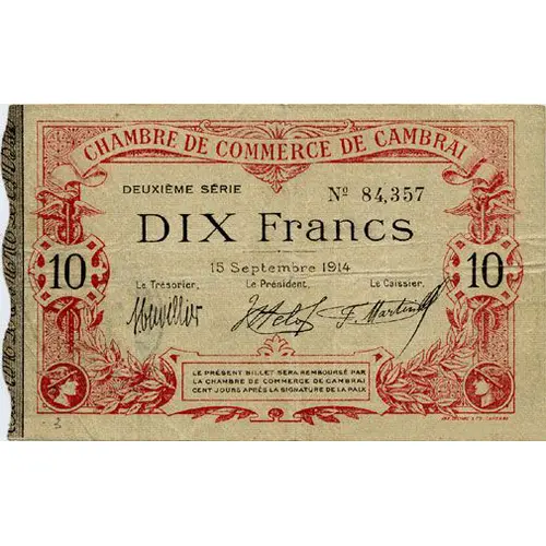 | Obverse lettering | CHAMBRE DE COMMERCE DE CAMBRAI DEUXIEME SERIE N° 84,257 DIX FRANCS 10 15 Septembre 1914 Le Trésorier Le Président Le Caissier LE PRÉSENT BILLET SERA REMBOURSÉ PAR LA CHAMBRE DE COMMERCE DE CAMBRAI CENT JOURS APRÈS LA SIGNATURE DE LA PAIX. IMP. DELIGNE & CIE CAMBRAI |