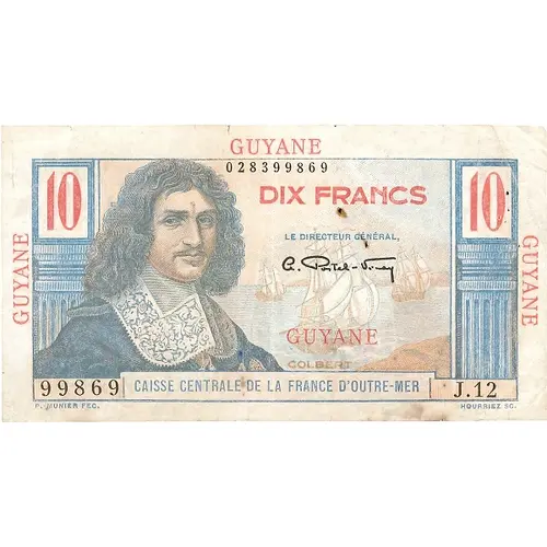 | Obverse lettering | GUYANNE 028399869 10 DIX FRANCS 10 LE DIRECTEUR GÉNÉRAL, G. Postel-Vinay GUYANE GUYANE GUYANE COLBERT 99869 J.12 CAISSE CENTRALE DE LE FRANCE D`OUTRE MER P. MUNIER FEC. HOURRIEZ SC. (Translation: Guiana Ten Francs The Director General Colbert Central Fund of Overseas France) |