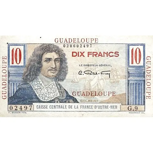 Obverse lettering GUADELOUPE GUADELOUPE GUADELOUPE 023152104 10 DIX FRANCS 10 LE DIRECTEUR GÉNÉRAL, G. Postel-Vinay GUADELOUPE COLBERT 52104 G.10 CAISSE CENTRALE DE LE FRANCE D`OUTRE MER P. MUNIER FEC. HOURRIEZ SC.