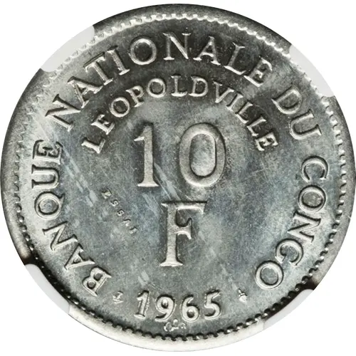 Obverse lettering BANQUE NATIONALE DU CONGO LEOPOLDVILLE 10 F ESSAI 1965 GAB