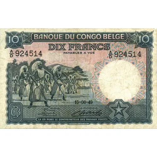 10 BANK VAN BELGISCH CONGO 10 TIEN FRANK BETAALBAAR OP ZICHT 10 DE NAMAKER WORDT DOOR DE WET MET DWANGARBEID GESTRAFT |