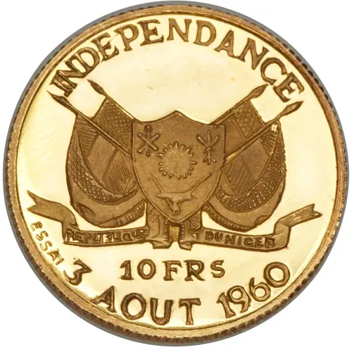 Historical Context: The 1960 10 Francs Independence essai coin from Niger stands as a profound numismatic artifact marking the nation's pivotal transition from a French colony to an independent republic. Issued in the very year of its sovereignty, under the nascent leadership of Hamani Diori, this pattern strike symbolizes Niger's assertion of national identity and economic autonomy. The creation of a distinct national coinage, even in trial form, was a crucial step in solidifying the new state's independence, projecting its newfound status on a tangible medium.