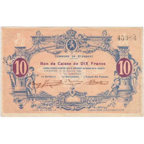 43964 COMMUNE DE STEMBERT Bon de Caisse de DIX Francs remboursable aussitôt que la situation normale sera rétablie STEMBERT, le 15 Octobre 1914. LE COLLÈGE : Le Secrétaire, Le bourgmestre, L`Echevin des Finances, (signature) (signature) (signature) 1914 VOIR AU VERSO LE CARACTÈRE D’AUTHENTICITÉ |