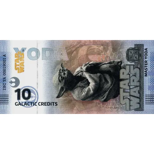 Obverse lettering YODA 10 GALACTIC CREDITS MASTER YODA ©&™ Lucasfilm Ltd.