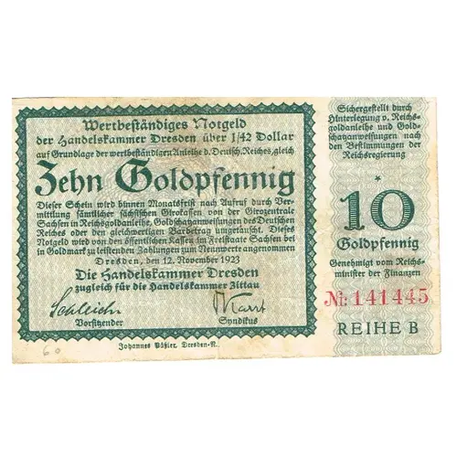 Wertbeständiges Notgeld der Handelskammer Dresden über 1/42 Dollar auf Grundlage der wertbeständigen Anleihe d. Deutschen Reiches, gleich Zehn Goldpfennig Dieser Schein wird binnen Monatsfrist nach Aufruf durch Ver- mittlung sämtlicher sächsischer Girokassen von der Girozentrale Sachsen in Reichsgoldanleihe, Goldschatzanweisungen des Deutschen Reiches oder den gleichwertigen Barbetrag umgetauscht. Dieses Notgeld wird von den öffentlichen Kassen im Freistaate Sachsen bei in Goldmark zu leistenden Zahlungen zum Nennwerte angenommen Dresden, den 12. November 1923 Die Handelskammer Dresden zugleich für die Handelskammer Zittau |