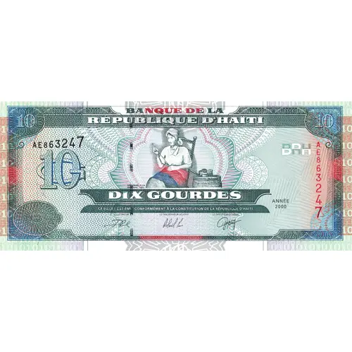 10 BANQUE DE LA RÉPUBLIQUE D’HAÏTI 10 (numéro de série) BRH 10G CATHERINE FLON ARCAHAIE 1803 DIX GOURDES ANNÉE 2000 CE BILLET EST ÉMIS CONFORMÉMENT À LA CONSTITUTION DE LA RÉPUBLIQUE D’HAÏTI LE GOUVERNEUR LE GOUVERNEUR ADJOINT LE DIRECTEUR GENERAL |