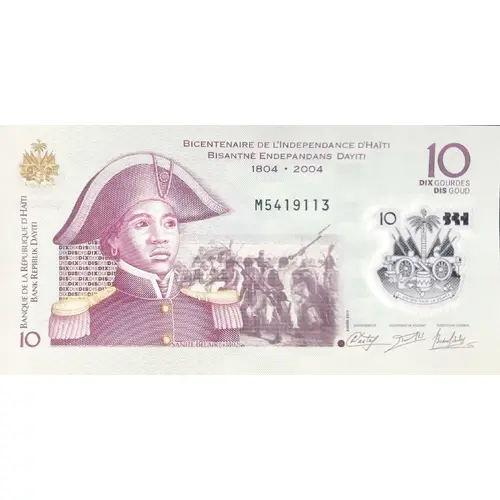 | 正面描述 | Lieutenant Mme Suzanne Sanite Belair (1781 - 1802). Battle scene. Coat of arms of Haiti (canons, flags, drum, anchor, soufflets, trumpet, sailing ship, palm tree with with Phrygian cap). |
