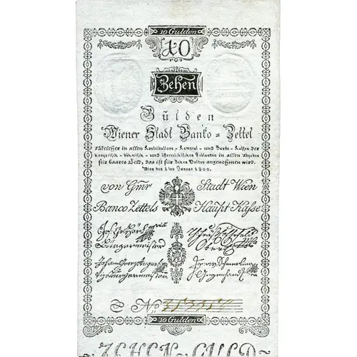 | Chữ khắc mặt trước | 10 Gulden 10 Zehen Gũlden Wiener Stadt Banko = Zettel Welcher in allen Kontributions – Kameral – und Banco – Kaſſen der hungariſch – böhmiſch – und öſterreichiſchen Erblanden in allen Abgaben für Baares Geld, das iſt für Zehen Gulden angenohmen wird. Wien den 1 ten Januar 1800. von Gm̃r Stadt Wien Banco Zettels Haupt Kaſse 10 Gulden ~ ZEHEN ~ GULD ~ |