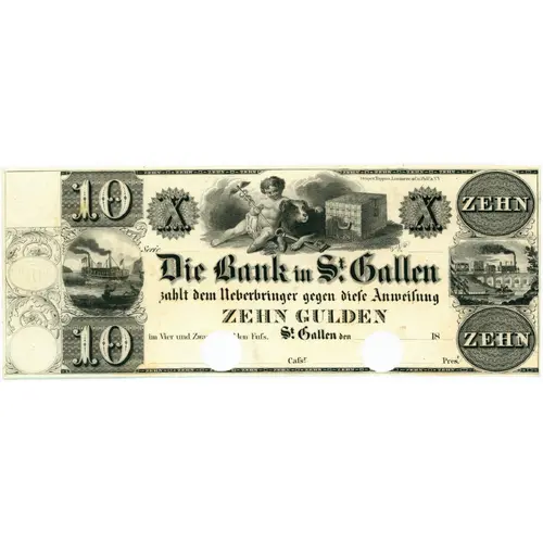| Opschrift voorzijde | 10 ZEHN X Serie _ Nᵒ. _ Draper, Toppan, Longacre & Co. Philᵃ. & NY Die Bank in Sᵗ. Gallen zahlt dem Ueberbringer gegen dieſe Anweiſung ZEHN GULDEN im Vier und Zwanzig Gulden Fuſs Sᵗ. Gallen den _ 18 _ 10 ZEHN Caſsʳ. Presᵗ. |