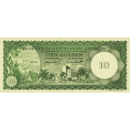 BANK VAN DE NEDERLANDSE ANTILLEN VOORHEEN DE CURAÇAOSCHE BANK TIEN GULDEN De Secretaris De Directeur JOH. ENSCHEDÉ EN ZONEN (Translation: Bank of Netherlands Antilles Former the Bank of Curaçao Ten Gulden Secretary Director Joh. Enschedé and Sons) |