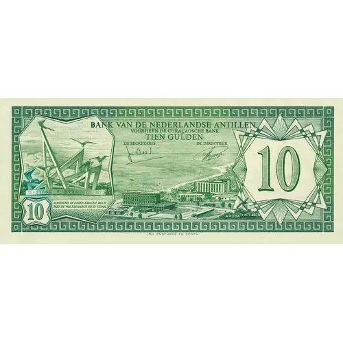 Obverse lettering BANK VAN DE NEDERLANDSE ANTILLEN VOORHEEN DE CURAÇAOSCHE BANK TIEN GULDEN De Secretaris De Directeur JOH. ENSCHEDÉ EN ZONEN