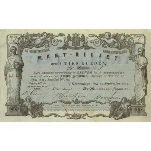 Letter - Nommer FY - 1 WETTIG BETAALMIDDEL - KONINCRYKDERNEDERLANDEN MUNT-BILJET groot TIEN GULDEN Elken werkdag verwisselbaar in zilver bij de Nederlandsche bank, als agent van `s Rijks Schatkist; ingevolge de wet van 26 April 1852, Staatsblad No. 90. Gezien bij de NEDERLANDSCHE BANK `s Gravenhage, den 15 September 1853. Geregistreerd - De Minister van Financien, Wet van den 26 April 1852, Staatsblad No. 90. (Translation: Letter - Number FY - 1 Legal Tender - Kingdom of the Netherlands Coin Note Ten Gulden Redeemable in silver every day at the Dutch Bank, as an agent of the Empire`s Treasury; pursuant to the law of April 26th 1852, Official Gazette No. 90. Seen at the Bank of Netherlands Gravenhage, September 15th 1853. Registered - The Minister of Finance Law of April 26th 1852, Official Gazette No. 90) |