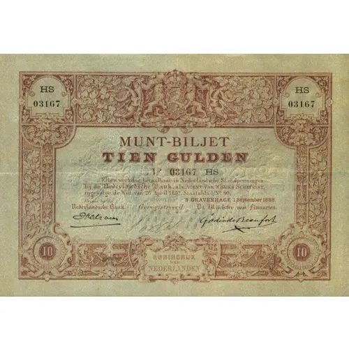 HS - HS 03167 - 03167 MUNT-BILJET TIEN GULDEN No 03167 Elken werkdag betaalbaar in Nederlandsche Standpenningen bij de Nederlandsche Bank, als agent van `s Rijks Schatkist, ingevolge de Wet van 26 april 1852, Staatsblad No. 90. Gezien bij de - `s Gravenhage 1 September 1888 Nederlandsche Bank - Geregistreerd - De Minister van Financien 10 - Koningrijk der Nederlanden - 10 (Translation: HS - HS 03167 - 03167 COIN-NOTE TEN GULDEN No 03167 Payable every day in Dutch standard coins at the Dutch Bank, as an agent of the Empire`s treasury, pursuant to the Law of April 26th 1852, Official Gazette No. 90 Seen at the - `s Gravenhage September 1st 1888 Dutch Bank - Registered - The Minister of Finance) |