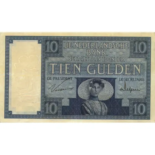 | Obverse lettering | 10 - DE NEDERLANDSCHE BANK - 10 BETAALT AAN TOONDER TIEN GULDEN DE PRESIDENT - DE SECRETARIS 10 (Translation: 10 - Bank of Netherlands - 10 Pay to the Bearer Ten Gulden The President - The Secretary 10) |
